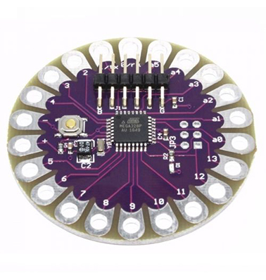 El LilyPad Arduino USB es una placa de microcontrolador basada en el ATmega32u4 . Dispone de 9 pines de entrada/salida digitales (de los cuales 4 se pueden utilizar como salidas PWM y 4 como entradas analógicas), un resonador de 8 MHz, una conexión micro USB, un conector JST para una batería LiPo de 3,7V y un botón de reinicio. Contiene todo lo necesario para soportar el microcontrolador; simplemente conéctelo a una computadora con un cable USB o enciéndalo con una batería para comenzar.